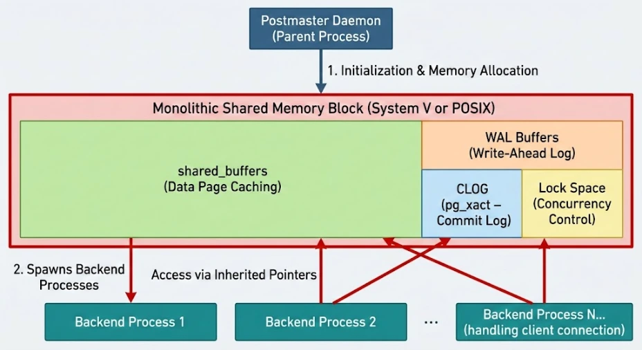 When the postmaster daemon initializes, before it accepts a single client connection, it allocates a monolithic block of System V or POSIX shared memory. Every subsequent backend process spawned to handle a client connection inherits pointers to this exact same memory space.